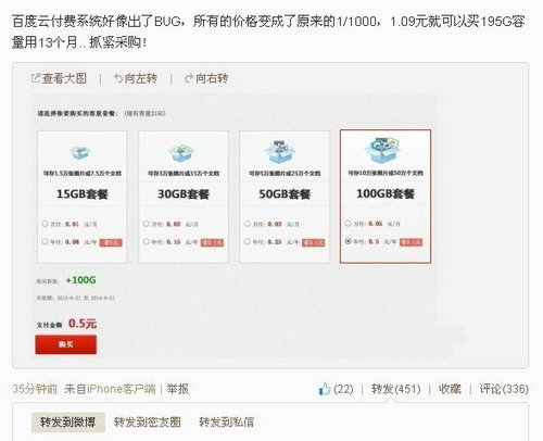 百度云是一款付费云存储产品,刚刚在微博平台上被曝付费系统出现严重BUG,所有产品的价格“变成”原来的1/1000。这一消息引起不少业内人士和网友的讨论和转发。