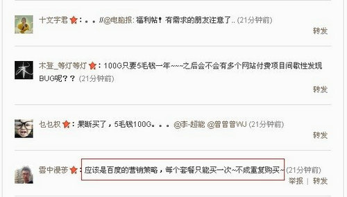 对于当前付费系统出现的BUG,百度官方还没有回应,暂不知道这些付费用户会不会被“封号”。在没有得到修复之前,预计百度云产品会迎来一次付费和下载高潮。根据一些网友提供的信息,此次百度云付费系统BUG的全面程度实在令人堪忧,所有套餐都可以以BUG价购买一次,另外百度云VIP服务也没有得到幸免,价格同样“变为”原来标准的1/1000。有网友称,他花了一毛钱,就买入了支持离线BT下载的VIP服务。