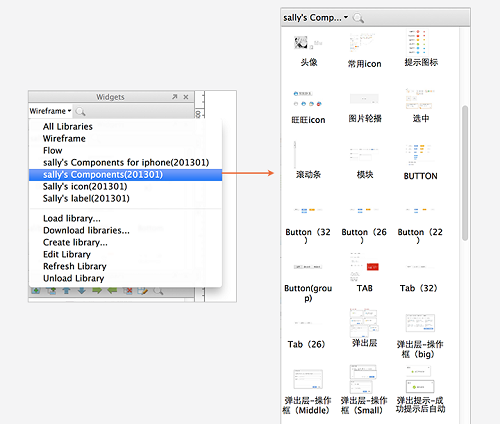 把常用的控件、功能组建、图标、标注等制作成通用的标准小单元,插入到部件库(widgets),在制作交互Demo时,只需要调出需要的控件即可,这可以大大的提高你的效率。