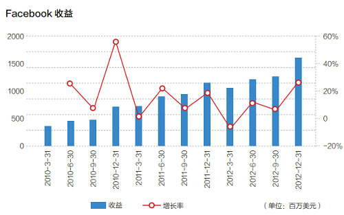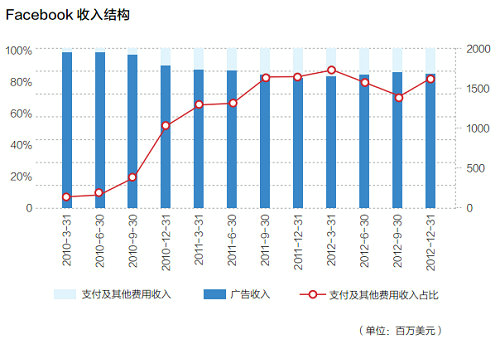 目前,来自社交游戏公司Zynga的抽成成为Facebook该项收入的主要来源,但是Zynga的贡献正在持续下降,预计将来此项收入会继续减少。另外,Facebook的收入还包括UserPromotedPosts(向用户收取一定费用,将该用户的帖子在其朋友的新闻中强调)和FacebookGifts(用户通过Facebook购买真实礼物),虽然这两项收入目前还微不足道,但依然包含在支付及其他费用收入中。
