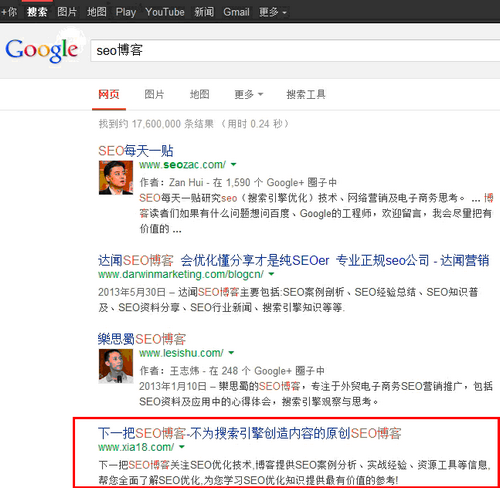 在关注网站在百度排名的同时,大部分站长都会关心自己在其他搜索引擎如谷歌的排名情况,大多数情况下都存在这种情况,网站在百度收录不好或者排名不好的一般在谷歌都收录好,排名好。下一把博客也是如此,如下图,在谷歌搜seo博客的时候,我的博客排名在第四位了。