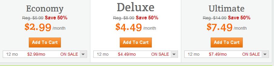 Godaddy虚拟主机的Economy方案2.99美元每月、Deluxe方案4.49美元每月、Unlimited方案7.99美元每月,不论你买多久都是这个价格。