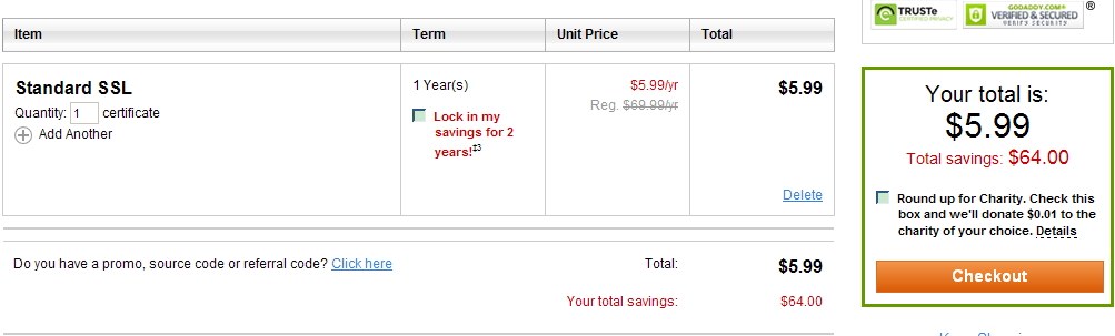 Godaddy的SSL证书很多用户都不陌生,最主要原因就是SSL证书安装之后会给主机分配独立IP,所以买SSL证书相当于同时买了SSL正式和独立IP。使用优惠链接www.gdssl.org购买Godaddy SSL证书Standard 方案单域名SSL证书产品,每年只需要5.99美元,购买多年的话也是这个价格。