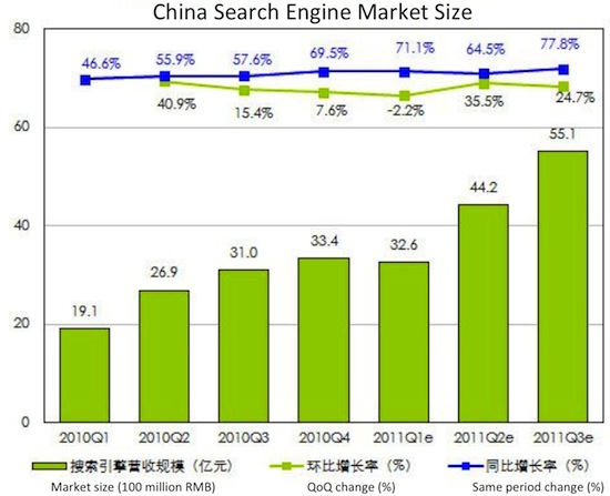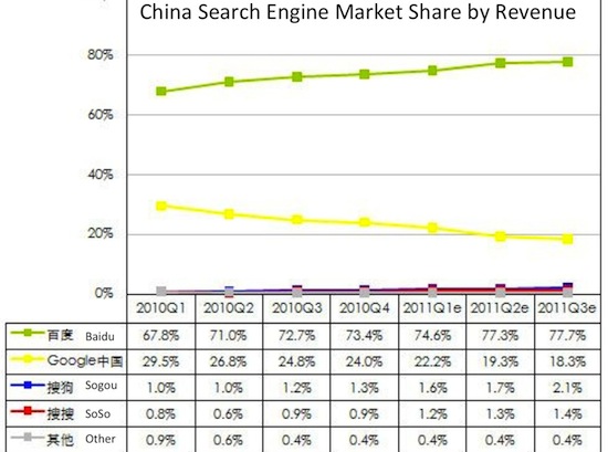 根据iResearch的2011年第三季度数据,从收益上看,百度目前在中国搜索引擎市场的份额为77.7%,谷歌为18.3%。