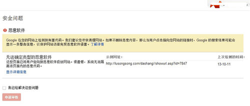 该工具可以显示URL问题,代码片段,并提供详细的帮助文档,只是该文档翻译的不好,估计站长读的人不多。使用方法:进入谷歌网管工具,选择左侧的“安全问题”