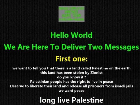 黑客在被黑的每个网站都留下了“MissionComplete”和“巴勒斯坦万岁”的字样,以及1946年至2000年的巴勒斯坦领土损失过程的示意图。