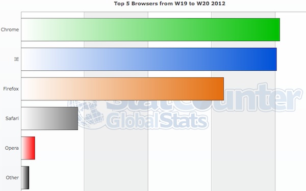根据 Statcounter 提供的监控数据,Google Chrome 过去一周全球使用量超过 IE,正式成为市场占有率最高的浏览器。这也是过去十三年来 IE 第一次整周平均使用量被其它浏览器所超越,在此之前 Chrome 周末所占份额有时已经超过 IE。