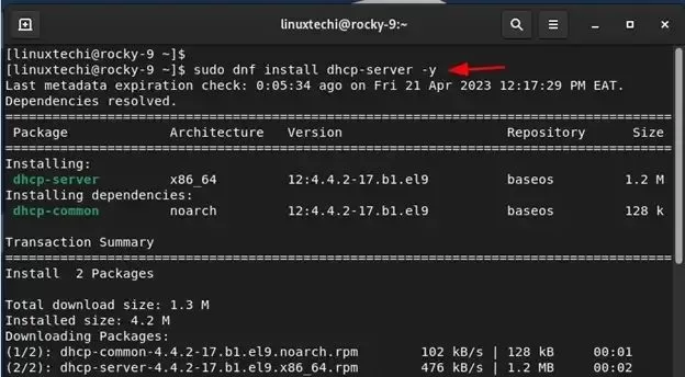 配置静态 IP 后,下一步就是安装DHCP服务器。RHEL 9 或 Rocky Linux 9 仓库 (BaseOS) 默认提供 dhcp-server 包,可以如图所示安装它: