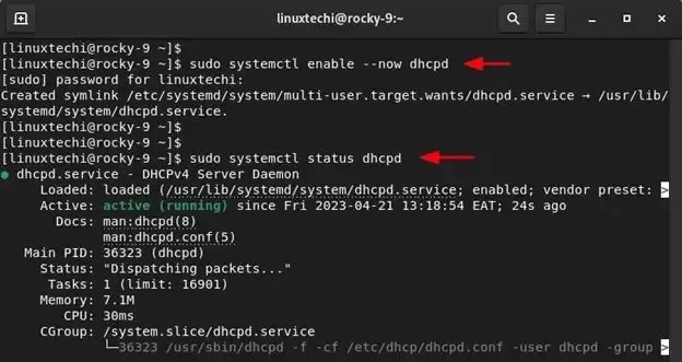 $ sudo systemctl enable --now dhcpd $ sudo systemctl status dhcpd