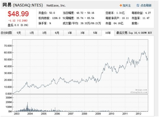 1997年6月成立的网易公司,立足于电子邮件,继以门户新闻、游戏,2000年6月30日在纳斯达克上市,发行价每ADS15.5美元,拆股复权后为3.875美元,目前每股48.99美元,总市值:63.84亿。
