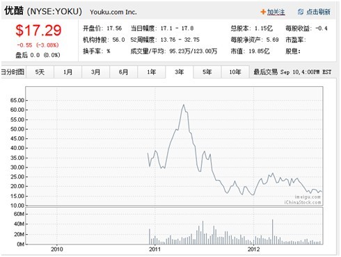 优酷网2006年12月推出,2010年12月在纽交所上市,发行价每股12.8美元,中途增发,目前每股17.85美元。