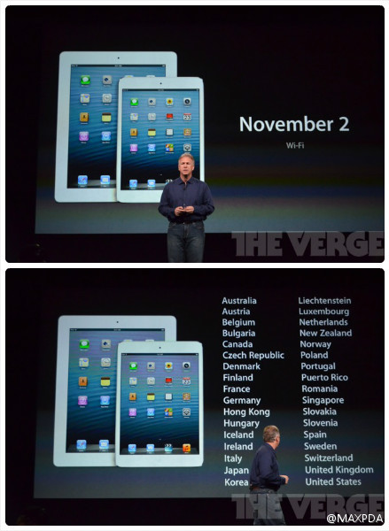 北京时间10月24日凌晨一点,苹果在美国圣何塞的加州剧院召开发布会,推出了旗下首款7英寸屏幕的平板电脑iPad mini。iPad mini售价为16GB的329美元,32GB的429美元,64GB的529美元,同时也提供4G版本,售价分别为459、559、659美元。10月 26日开始接受预订,11月2日发货!首批上市地区包括香港,中国大陆仍无缘首发。