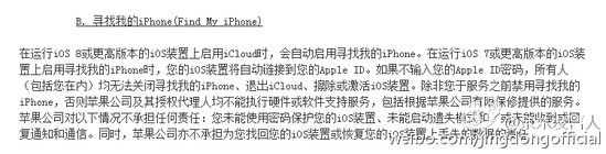 iPhone在进入售后环节时,需要关闭“寻找我的iPhone”功能、退出iCould、擦除或激活等操作,但是用户在运行iOS 7及更高版本操作系统的iPhone产品上启用“寻找我的iPhone”功能时,将自动链接到用户绑定的的Apple ID。如果不输入该Apple ID和密码,所有人均无法关闭“寻找我的iPhone”、退出iCloud、擦除或激活产品。故苹果公司要求售后服务之前禁用“寻找我的iPhone”,否则苹果公司将不提供保修服务。详情可以参见苹果公司官方网站关于iCloud的详细条款(相关内容截图如下):