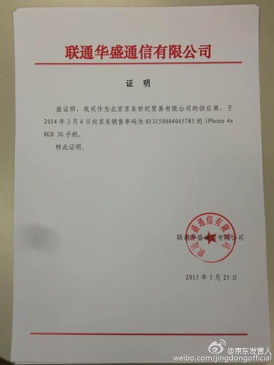 经查,媒体报道中提及的客户吴女士和赵先生,分别于2013年12月21日和2014年3月8日在京东购买iPhone 5C 32GB手机(串码:358027057986110)和iPhone 4S 8GB手机(串码:013150004045785),两部手机的供货商为中国联通全资子公司联通华盛,供货来源正规可靠,详细参见附录1。