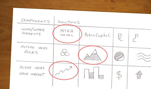 然后还要对客户进行一些研究,研究他们的经营模式,研究他们的产品,他们的商务模式。最后我发现PetraCapital专攻矿业类股票,Petra”在希腊语里的意思是”岩石”。这是非常有趣的细节,我可以把这一点融入到Logo设计中。