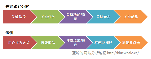 对于关键路径中的任务,我们可以按以下层级进行细分。首先从任务出发,将关键路径分解为不同的关键任务,这需要你在之前的准备工作中对网站的结构和提供的功能有详细的了解。然后将关键任务分解为关键功能或页面,这需要你对网站的页面URL规则和关键功能的内在逻辑和流程有详细的了解。再将页面分解为不同的元素,最后分解为访问者的不同动作。