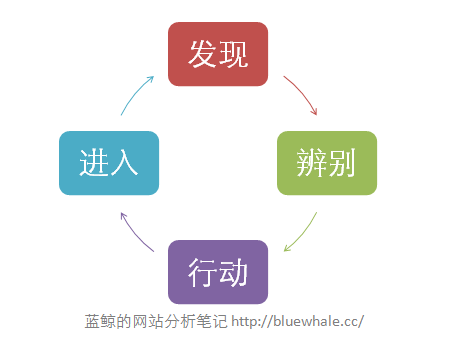 最后一步是行动,这个行动通常是点击。也是我们关注最多的一步。行动是访问者在关键路径中一个循环的结束,同时也是下一个循环的开始。当访问者点击了一个链接后会重新回到第二步,在新的页面和信息中完成发现,辨别和行动的过程。这个过程在每个页面和任务中周而复始,推动访问者在关键路径中前进。