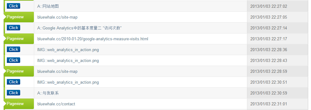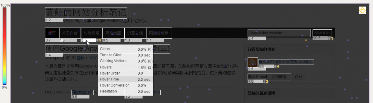 我们使用时间对访问者的决策过程进行度量。从访问者将鼠标移动到关键信息之上,到点击关键信息这之间的时间我们称为访问者对于该信息的决策时间,从技术角度上来说叫做鼠标悬停时间。清晰明确的信息可以让访问者快速做出判断,从而减少决策的时间。在上面的截图中显示了访问者在我博客首页导航及一些关键信息的决策时间。很明显主导航的“与我联系”这部分存在一些问题。