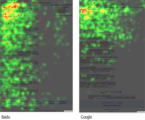 一个国外研究机构(出处不详,如有请告知,我会加上链接)在研究和对比百度与谷歌用户首页扫视热力图后发现,百度用户和谷歌用户的行为还是会存在明显差别的,在谷歌,用户找到他们想要的信息通常只需要百度用户一半的时间(谷哥是30秒,而度娘是55秒),大部分用户只看前三个结果;反之,在百度,用户通常会把搜索结果上的内容从头扫到尾,同时我们注意在百度的那张热力图上,红点表示点击,大量出现在百度搜索框和底部相关搜索上,而非搜索结果的网页,这对于百度来说可不算是一个给力的数据,那为啥会这样子?我觉得很大程度原因要和搜索质量有关,百度的搜索结果相对是比较混沌的,很多时候用户根本分不清那些是付费广告,那些是自然结果,而通常这些付费广告的内容又不能很好满足用户的需求,所以用户可能会选择再次提炼搜索字词,或者干脆拉到底部看相关推荐去再次寻找他们真正想要的内容。当然,可也是为什么百度用户平均要花费55秒,几乎是谷歌的两倍的搜索时间去发现他们想要的信息。