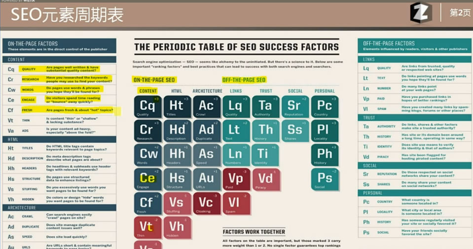 首先我们要搞清楚怎么看这个周期表,它其实就是化学元素周期表的临摹,用可视化设计表现出seo元素对于整个算法体系的重要性。当然是把部分元素搬了上来,并不是所有元素。周期表把seo中站内优化(on the page seo)和站外优化(off the page seo)拆分出来。每个元素块由两个英文字母构成+权重分+解释。元素块英文首字母是使用类别英文首字母比如在content(内容)类别下就是C,元素块英文第二个字母是元素名,比如Cq中的q指的是quality。因此这2个字母构成了一个元素块的表现,随后右上角有一个权重分。+为正值(好的),颜色设定为深浅绿色,-为负值(不好),颜色为粉红色。正值的元素块是根据每个优化分类下做的核心提炼,也是提倡我们优化人去做的,粉丝是违反优化原则的,英文为violation,因此粉丝元素块都是V打头的字母。随后整个表格的左右两边是对每个元素块进行解释,接下来爆老师就给大家具体描述一下每个元素块的注解或是意思吧。