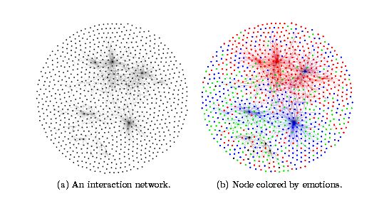 左图:每个黑点代表用户。右图:每个点代表一条微博。红色代表愤怒,绿色代表高兴,蓝色代表忧伤。