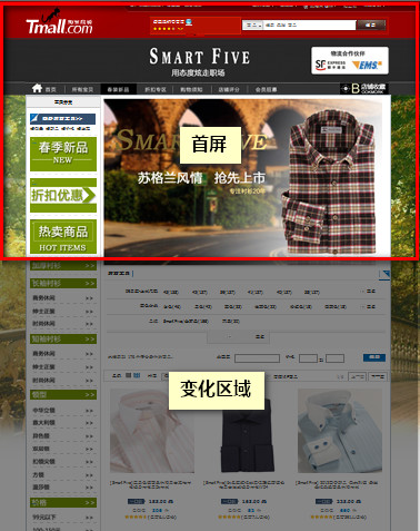 “above the fold(头版)”的概念延伸到互联网领域。用来指代web网页中不用滚动屏幕看到的信息。与出版业的“头版”不同的是互联网的首屏区域是动态的,由于互联网用户复杂的屏幕分辨率环境,导致他们看到的首屏内容有很大差距。很多店铺设计就是因为对首屏的忽视导致很严重的体验问题。