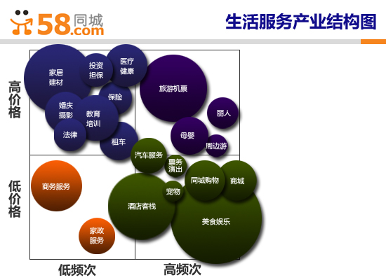 低频低价格的产品,必须依靠平台型的产品才能降低流量成本,这也是58同城的优势所在。这一块非常适合58同城、Craigslist这样的综合分类信息网站,它把很多的服务长尾集中起来,弥补了单个服务的访问低频次的缺点。