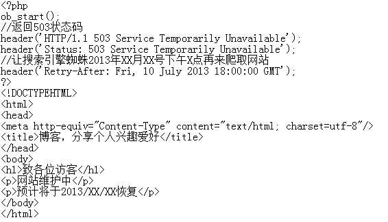 说到网站内容优化,其实除了为访客提供有价值的原创内容外,还应该注意一些细节的优化。比如说一些HTTP状态码的运用,相信对网站优化推广有一些了解的站长应该对如何自定义设置401错误页面、自定义404错误页面、301跳转等的运用不会陌生,而这里我想分享一下如何使用503状态码。