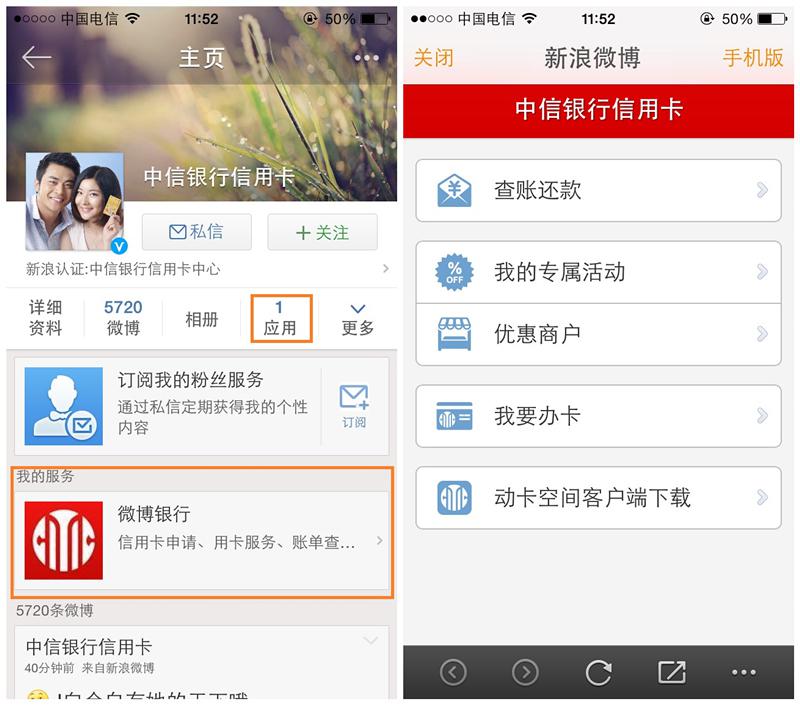 这一传言已经得到证实,昨日,中信银行悄然推出微博银行服务,在新浪微博主页开辟微博银行入口,为用户提供查账还款、积分、活动查询、办卡申请等多项服务。