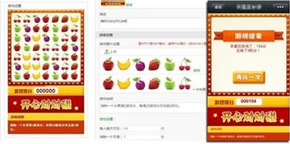 上图左边是此游戏模块的设置界面,右边是微信游戏结束的手机截图。游戏可以设置粉丝每天进来玩多少次、游戏的得分机制以及游戏得分与积分的兑换比例等。最重要的一个特点是游戏中的六种水果元素也可以自定义,比如上传自己的六款产品图片作为游戏元素,相信这样玩起来变得更有自己的品牌特色,增加粉丝对自身的记忆度。