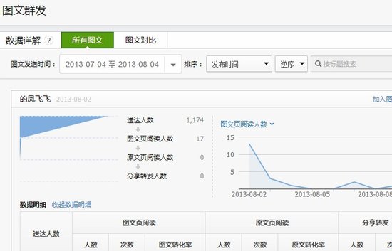 图文分析统计中,运营者比较关心的数据已都有详细的显示,比如图文消息中的每篇文章有多少用户接收,真正点进文章进行阅读的人数、该文的分享转发人数和次数、图文转化率等数据都可以查阅。