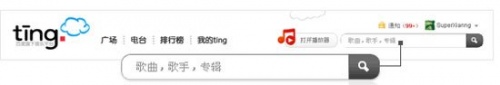 百度Ting!分为广场、电台、排行榜、我的Ting!四大栏目,用户可以在百度Ting!搜索框中输入歌曲名、专辑名、音乐人姓名来进行查找想要的信息。还可以通过寻找ting友来搜索ting上的其它用户。