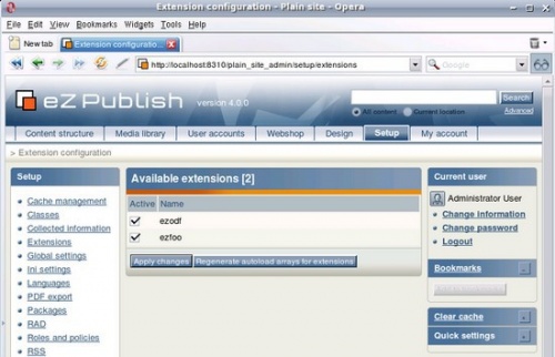 管理界面 登录到eZ Publish 管理界面,点击“设置”标签,然后点击左侧的“扩展”菜单。可以看到一个显示所有可用扩展的列表与对应的复选框。要激活示例扩展,勾选下图中的复选框然后点击“应用”按钮。