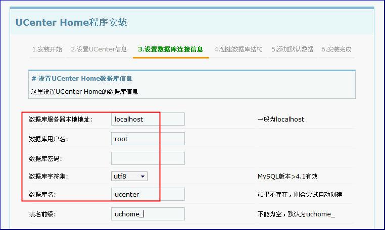 在UCenter Home设置数据库连接信息步骤,需要设置与UCenter使用同一数据库,这样可以实现基于UCenter下的各个系统中的IM互通信息。本例安装UCenter时使用的数据库名是ucenter,所以此处填写ucenter并提供用户名和密码,如下图