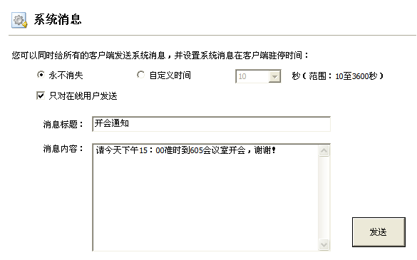通过点击“系统工具”-->“系统消息”可以发送系统消息给客户端,可以设置系统消息Tips在客户端停留的时间,也可以只发送给在线的用户,如下图所示:
