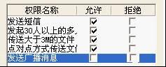 在权限列表中目前包括“修改姓名”、“发送短信”、“发起指定人数多人会话”、“发送指定大小的文件”、“使用P2P方式传送文件”、“发送全员广播消息”、“远程登陆”“发送所属部门广播消息”、“发送外部多人会话”、“对外发送指定大小的文件”、“无限制对外发送文件大小”等权限。