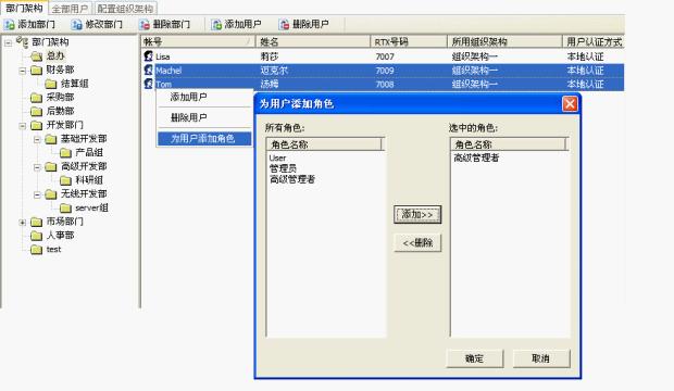 如要为某一角色批量添加某一组织架构下的多个用户,请您进入组织架构页面。选中你所要添加角色的用户。在鼠标右键菜单中选择“为用户添加角色”,在弹出的窗口中,选择您所要为用户添加的角色进行添加即可。