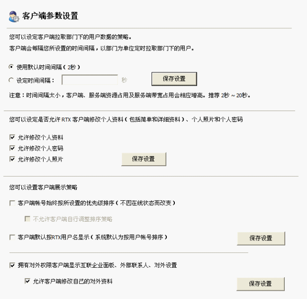 管理员可以在此设置客户端用户拉组织架构的策略、是否允许客户端修改个人资料、客户端展示策略。管理员在此进行简单设置,点击“保存设置”,即可实现该策略。如图所示: