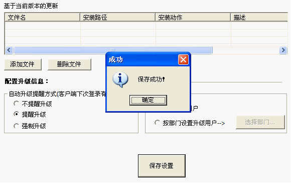 在自动升级中,可以单独升级客户端程序或插件,也可以两者同时升级,配置完成之后保存设置,客户端重新登录即可看到升级提醒。