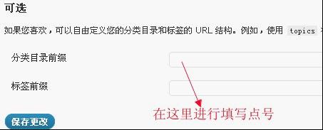 2、接下来在“可选”选项下的“分类目录前缀”后面的文字框中填写一个英文的点号“.”,然后保存更改,这个样网址中的category就去掉了。