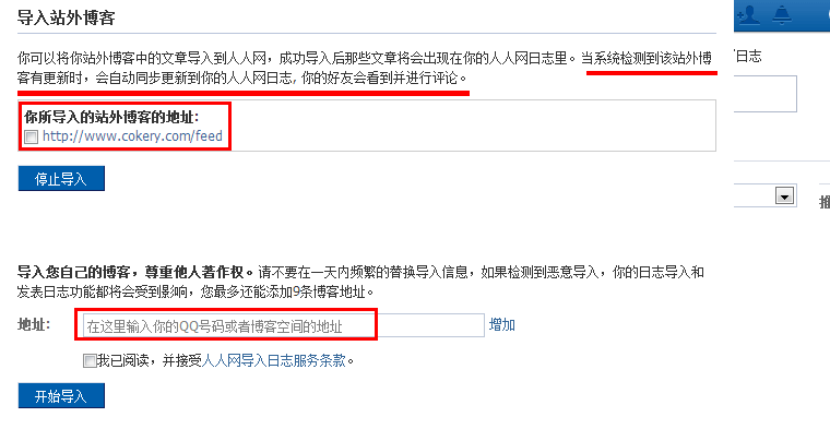 然后在“地址”一栏,输入你的博客的Feed订阅地址,直接输入博客的域名是无效的,例如这里Cokery的博客的Feed地址:http://www.***.com/feed。需要注意的是,这里只能导入最新的10篇日志哦!如下图所示:
