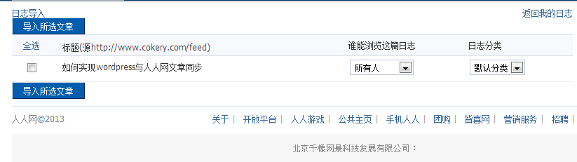 这样就可以实现文章发布后同步到人人网了,不用再单独复制粘贴,很是省心,当然如果没有更新,也可以手动导入一下。