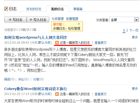 选择好需要导入的文章,然后点击“导入所选文章”即可成功导入你博客的文章了,这其实就是一种类似于Feed订阅的方式把博客文章同步于你的人人网中,效果如下图所示:
