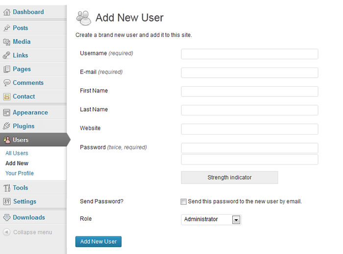 登录到WordPress博客后台,在后台控制面板中,找到“Users(用户)”,点击“Add New(添加新用户)”,如下图所示